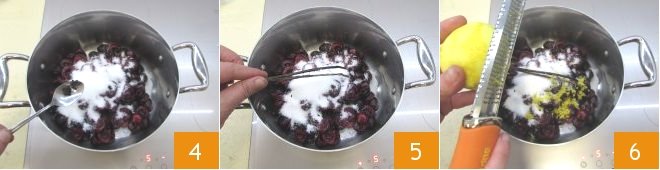 Add the vanilla pulp 4 and also the emptied pod 5. Grate the lemon zest into the saucepan 6.