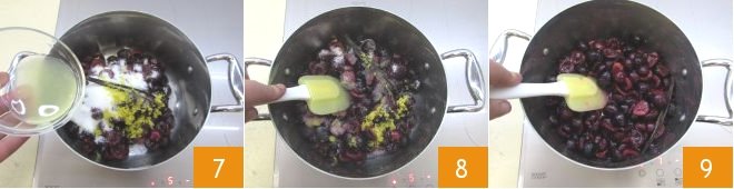 To prepare the cherry and vanilla compote, first wash the cherries thoroughly with cold water 1. Drain them and remove the pits and stems 2, then gather them in a thick-bottomed saucepan, adding the sugar as well 3.