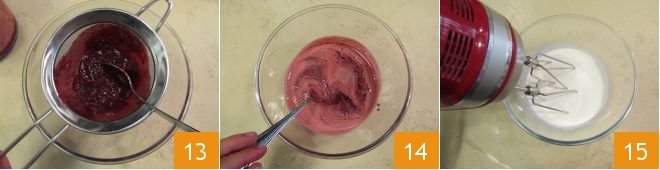 Strain the obtained juice with a sieve 13 to remove the skin residues 14. Pour the well-chilled liquid cream into a bowl 15.