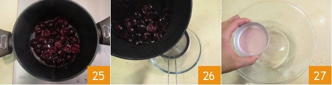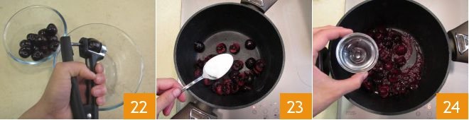 For the decoration, make a warm coulis: pit 100 g of cherries 22 and split them in two with your hands, placing them in a saucepan with the sugar 23 and lemon juice 24.