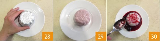 Invert the Bavarian creams onto the plates (28-29). Decorate with the coulis 30 and serve your cherry Bavarian creams immediately.