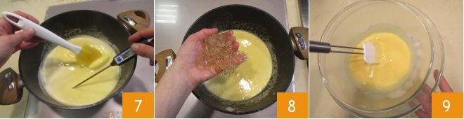 Return to the heat, cooking until it reaches a temperature of 180°F 7. Remove from heat, add the gently squeezed gelatin 8, stir, and strain again into a bowl. Cool the cream by placing its base on another bowl containing cold water and ice 9.