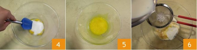stir with a spatula 4 to get a smooth mixture 5. Strain the now hot milk and pour it over the yolks 6, stirring everything with the spatula.