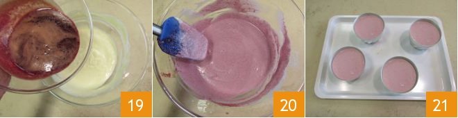 Incorporate the strained cherry juice 19, stir 20, and pour it into 4 Bavarian cream molds with a capacity of approximately 5 ounces 21. Chill in the fridge for at least five hours.