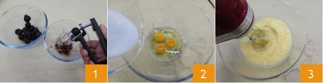 To prepare cherry clafoutis, wash the cherries, dry them, remove their stems and pit them 1. Set them aside and start making the batter: in a bowl, combine room temperature eggs with sugar 2 and start beating them with a mixer 3.