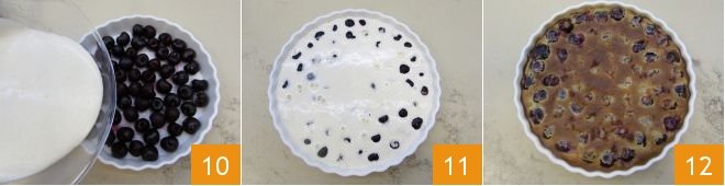 Distribute the pitted cherries on the bottom of the baking dish until they cover the entire area 10 and pour the batter over them 11. Bake in a preheated static oven at 350°F (180°C) for 55 minutes, until it is well golden on the surface 12 (if using a fan oven, bake at 320°F (160°C) for about 45 minutes). Once cooked, remove your cherry clafoutis from the oven, let it cool slightly, and serve.