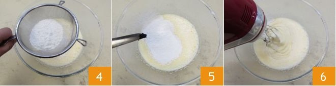 Once you have a light and frothy mixture that has doubled in volume, add the sifted flour 4, salt, and vanilla bean seeds 5 (to obtain them, you will need to cut the bean and scrape it with a knife). Then continue beating with the mixer at low speed 6.