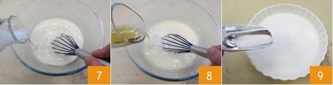 Using a hand whisk, gradually add the milk, not too cold, little by little 7, and the brandy 8. In this way, you will obtain a batter that is not too thick. Lightly butter a low-edged baking dish with a diameter of 11 inches (28 cm) and sprinkle it with sugar 9.