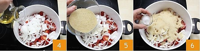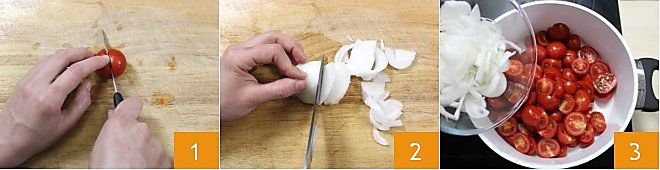 To prepare the cherry tomato chutney, start by washing and drying the cherry tomatoes well. Then place them on a cutting board and cut them in half 1. Then peel the white onion, cut it in half, and slice it thinly 2. Now take a large pot and add the halved cherry tomatoes and sliced onion 3.