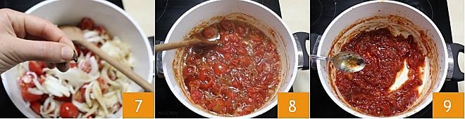 Finally, add the cloves 7 and cook everything over low heat for 1 hour from the first boil 8, until you get a thick mixture. The tomatoes should not completely disintegrate. Once cooked, remove the cloves from the mixture 9.