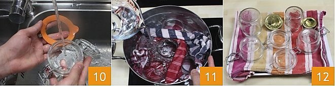Now take care of sanitizing the jars where you want to store your cherry tomato chutney, following the Ministry of Health guidelines found at the bottom of the recipe. Carefully wash the jars under water and check that there are no cracks or chips on the surface. For jars with airtight seals, also wash the gasket and set aside 10. Line a large pot with a clean cloth and place the jars inside with the opening facing up, wrap other cloths around the jars to prevent them from breaking during cooking, and pour the water into the pot until it is filled 11. Bring to a boil and cook for another 30 minutes. Add the lids ten minutes before draining. Allow cooling, then drain them and let them dry upside down on a kitchen towel 12.