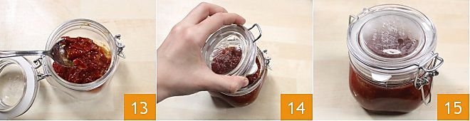 Transfer the still-hot cherry tomato chutney into the jars 13 that you have sanitized, leaving at least 0.4 inches of space from the rim of the jar, close 14, and store in a cool, dry place, first ensuring that the vacuum has been correctly formed 15. If you are using jars with rubber gasket closures, when consuming the cherry tomato chutney, you can test the vacuum by pulling the tab: if pulling it produces a sharp noise, it means that the content has been preserved correctly with a vacuum. On the other hand, if pulling the tab the gasket is "soft," it means the vacuum was not created correctly and it's better not to eat the content. If you are using jars with twist-off lids, close tightly but not too tightly and let them cool. With the heat of the mixture, the vacuum will form, which will allow the product to be preserved for a long time. Once the jars have cooled, check if the vacuum has formed correctly: you can press the center of the lid, and if you do not hear the classic "click-clack," the vacuum has occurred. Once you have verified that the preservation was successful, your cherry tomato chutney is ready to be enjoyed!