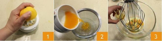 To make the chess cake, start with preparing the light cake; grate the orange zest 1 and then squeeze and strain the juice 2. Place the eggs, salt, and honey 3 in a stand mixer fitted with a whisk,
