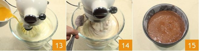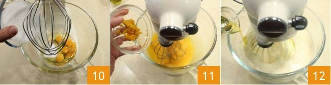 Meanwhile, prepare the dark cake following the same procedure as the light one: place the eggs, salt, honey, and granulated sugar 10, the orange zest 11 in a stand mixer fitted with a whisk; turn on the mixer and whip the mixture until it becomes fluffy, then slowly pour in the olive oil 12,