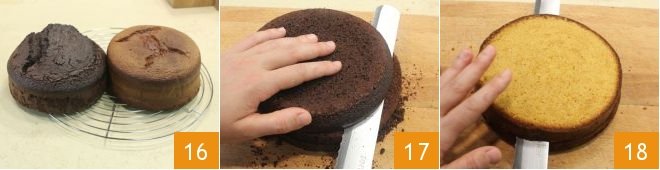 Once baking is complete, remove the cakes from the oven, let them cool, and then remove from the pans 16. Divide each cake into 3 equal discs (17-18),