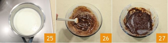 heat the cream 25 and pour it over the chopped chocolate, stir to melt the chocolate 26 and obtain a thick cream, cover with cling film touching the surface 27 and let it cool in the refrigerator until it becomes a firm but spreadable ganache cream.