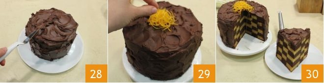 Coat the surface of the cake and the edge with strokes of ganache, using a spatula to create an irregular, non-smooth effect 28. Finally, decorate the top with orange zest cut into julienne strips 29, your chess cake is ready to be enjoyed 30.