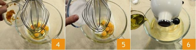 the orange zest 4, and granulated sugar 5. Turn on the mixer and whip the mixture until it becomes fluffy, then slowly pour in the olive oil 6,