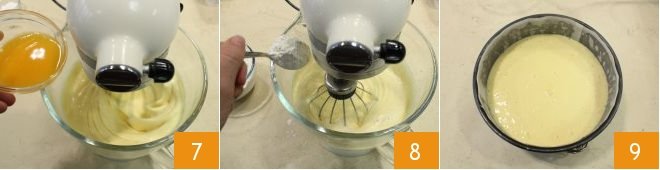 and the orange juice 7. Finally, incorporate the dry ingredients: the all-purpose flour, almond flour, and previously sifted baking powder 8, one tablespoon at a time. Butter and line an 18 cm diameter pan with high sides of 10 cm with parchment paper, pour in the batter 9 and bake in a preheated static oven at 356°F for 1 and a half hours (or 320°F in a fan-assisted oven for 1 hour and 20 minutes).