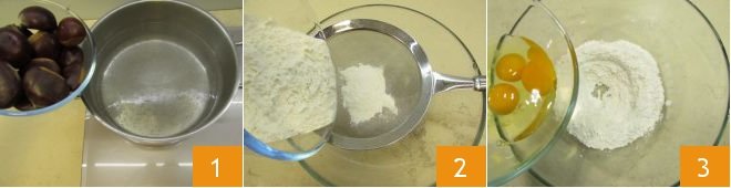 To make the chestnut and sausage ravioli, start by boiling the chestnuts: place the whole chestnuts in a pot of boiling water 1 and boil them for 30 minutes. Meanwhile, prepare the pasta: sift the flour into a bowl 2, add the eggs 3.