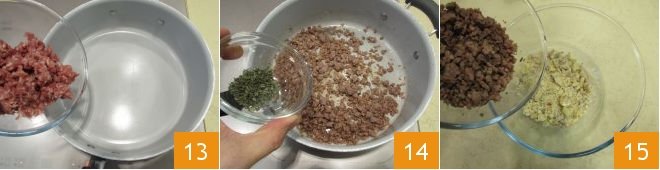 In a pan, add the sausage 13, brown it in its fat for 5 minutes, then season with the chopped sage 14. In a bowl, crumble the chestnuts coarsely with your hands, add the browned sausage 15