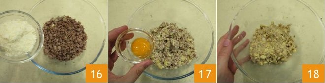 season with grated Grana Padano 16, start mixing then add the egg 17 and knead the filling to combine 18.
