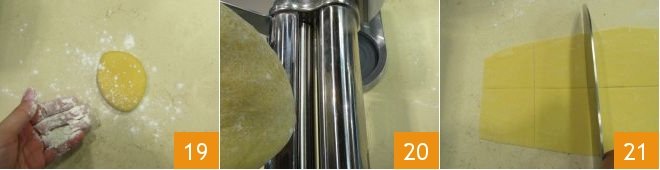Take the dough, divide it into pieces with a dough cutter, flour each piece 19, pass the first piece (you can keep the others wrapped in plastic wrap until you roll them out) and insert it into the pasta machine 20, you will need to work it from the thickest setting to the second last, passing the pasta through this setting multiple times until you obtain sheets about 1/16 inch thick (2-3 mm). Divide the sheet in half and cut into squares about 2x2 inches 21.