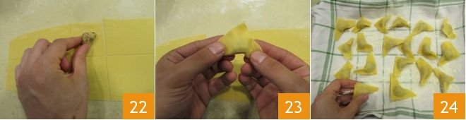 In the center of each square, place a small ball of filling 22. Fold the pasta, aligning two opposite corners to create triangles 23 and seal the edges well with a light pressure of your fingers. As you make the ravioli, place them on a tray lined with a floured cloth 24.