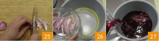 Place a pot with plenty of water on the heat, which will later be used to cook the ravioli; salt the water and bring to a boil. Meanwhile, clean and thinly slice the shallot 25. Heat the olive oil in a pan, add the shallot 26 and sauté for a few minutes, then cover it with the young wine 27 and cook over medium heat for 30 minutes to reduce the sauce.