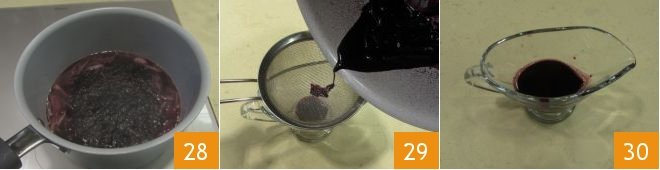 When the sauce has thickened, turn off the heat 28 and strain it through a sieve (29-30).