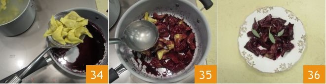 Once the ravioli are ready, drain them with a slotted spoon directly into the pan with the young wine sauce 34, add a ladle of cooking water 35 and toss for a few moments, just to flavor the ravioli. Serve the chestnut and sausage ravioli immediately, garnishing the dish with fresh sage leaves 36.