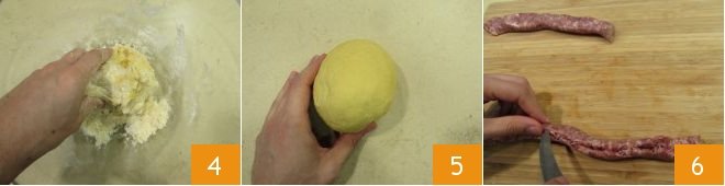 Knead with your hands 4 until you obtain a compact dough 5, wrap it with plastic wrap and let it rest for 30 minutes in a cool, dry place. Meanwhile, attend to the sausage: cut the casing lengthwise 6