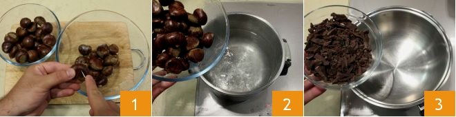 To prepare the chestnut spoon cups, start with cooking the chestnuts. Score the chestnuts with a small knife 1, then drop them into boiling water 2 and boil them for about 30 minutes (you can reduce the time using a pressure cooker) 2. While the chestnuts are cooking, coarsely chop the dark chocolate and place it in a bowl set over a saucepan to melt the chocolate in a double boiler 3; make sure the water in the saucepan does not touch the bottom of the bowl.
