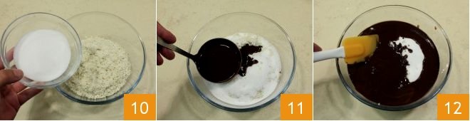 Collect the flour obtained in a bowl, add the sugar 10 and the melted chocolate mixture 11. Mix everything with a spatula 12