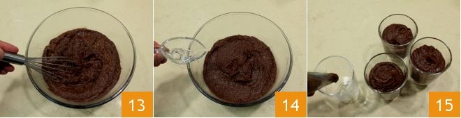 then work it with a whisk 13 and finally add the rum 14. Place the mixture obtained in a piping bag without a nozzle or with a fairly wide nozzle. Take 4 cups with a capacity of 4.6 oz and pour the cream inside, leaving at least 1.5 inches from the edge 15.