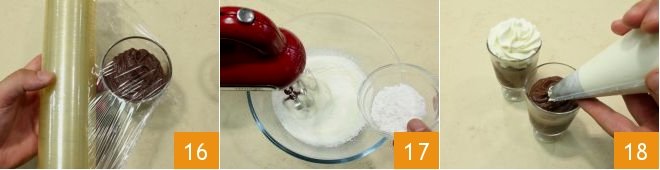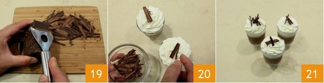 Cover with plastic wrap 16 and place them in the refrigerator to set for at least 1 hour. In the meantime, whip the fresh cream with the powdered sugar 17, then take the cups out of the refrigerator after 1 hour and with the help of a piping bag with a star nozzle, complete each cup with a dollop of cream. Grate the dark chocolate with a vegetable peeler to create shavings to garnish the cups.