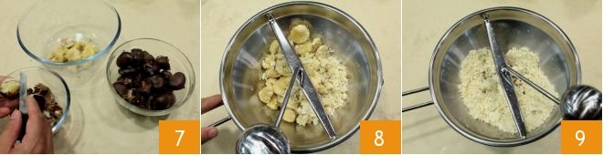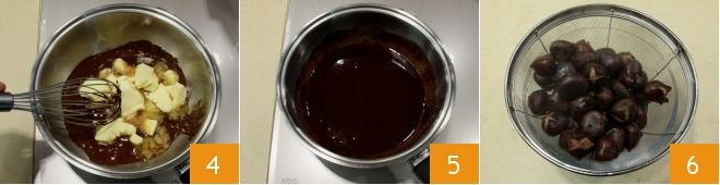 When the chocolate is melted, add the butter and stir with a whisk 4 to melt it into the chocolate. Then set the prepared mixture aside 5. Drain the now-cooked chestnuts 6,