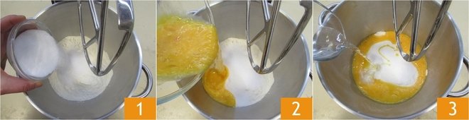 To prepare the chiacchiere in the air fryer, first sift the flour and baking powder into the bowl of a stand mixer equipped with a paddle attachment. Add the sugar 1 and salt, then pour in the eggs and the yolk, which you have lightly beaten together 2, and finally the grappa 3. Mix at medium speed to blend the ingredients well.