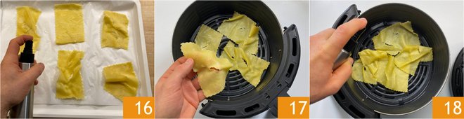 Spray the blanched sheets with the water and oil emulsion 16; alternatively, you can brush them. Place the chiacchiere in the air fryer (we used a fryer with a 6-quart capacity) 17, close with the lid, and cook at 392°F for about 5 minutes. Every minute or minute and a half, open the door to check they haven't stuck together and spray the sheets again with the emulsion 18.