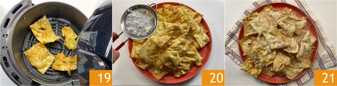 When they are nicely golden 19, transfer the chiacchiere to a tray and let them cool completely, then sprinkle with powdered sugar 20. Your air fryer chiacchiere are ready to be enjoyed 21!