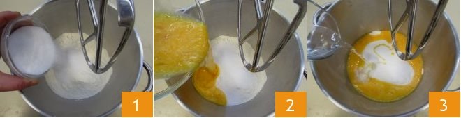 To prepare chiacchiere, sift the flour together with the baking powder and pour it into a stand mixer fitted with a spatula attachment. Add sugar 1, salt, previously beaten eggs 2 and grappa 3. Mix all the ingredients well.