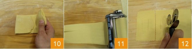 Fold the short sides of the strip of dough towards the center 10, then continue to roll it out using an increasingly thinner setting on the pasta machine each time, until it reaches a thickness of 0.88" (2 mm) 11. Do the same with the remaining portions of dough. Let the rolled dough rest for a few minutes and in the meantime bring the oil to a temperature of 300° F (150-160° C). Using a pastry wheel, cut the dough into 2-inch x 4-inch (5 x 10 cm) rectangles and make two central cuts on each shape, parallel to the long side on each one 12.
