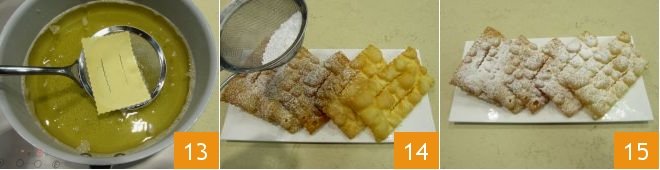 As soon as the oil has reached the right temperature, dip 2-3 rectangles of dough with the help of a skimmer 13 and cook them turning them on both sides until they are golden brown. Drain the fritters on a paper towel. Once they are cold, place them on a plate and sprinkle them with plenty of sifted powdered sugar 14.