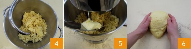Replace the spatula with the hook attachment 4, add the vanilla bean seeds and butter 4, then continue kneading for 15 minutes until a homogeneous mixture is obtained 5which should be firm, but fairly soft to the touch. If necessary, you can add 1-2 teaspoons of water. Transfer the dough onto a work surface, and quickly shape it into a ball 6.