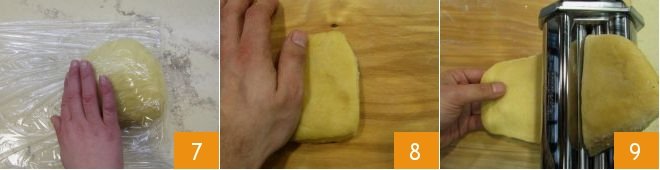 Wrap the dough with plastic wrap and let it rest at room temperature for at least 30 minutes 7. Next, divide the dough into portions of about 5 oz (150 g) each and start kneading each individually. Flatten a first portion slightly with the palm of your hand 8, sprinkle it with flour and roll it out with a pasta machine set to the widest thickness 9.