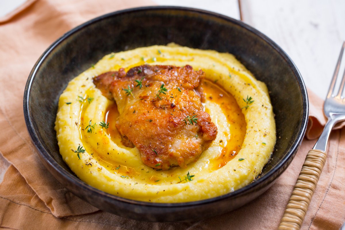 Pollo e patate, or chicken and mashed potatoes the Italian way, is what makes Sunday dinners feel cozy and laid-back. Not your usual roast and baked potatoes, this one uses juicy chicken thighs, or sovracosce—really good stuff—which get pan-cooked until tender and packed with flavor. And here's the thing, there's this homey trick: as the chicken cooks, it's brushed with oil warmed with garlic and herbs. Super tasty. It's simple, but it gives the chicken a really moist and savory taste. When the chicken's ready, it's placed on a bed of creamy mashed potatoes—smoother than your usual rustic mash. These potatoes soak up all the delicious pan juices, making every bite so so comforting, like a classic chicken mashed potato bowl but with that Italian touch.