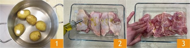 To prepare the chicken and mashed potatoes, first boil the potatoes starting from cold water for about 35-40 minutes, or until they are soft enough to be easily pierced with a fork 1. Meanwhile, take the chicken thighs, season both sides with oil 2 and salt, then massage the meat with your hands 3. Let it rest for 10 minutes.
