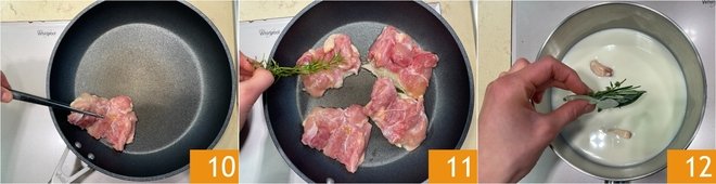 Place the thighs skin-side down in a warm pan 10 and brown over medium heat for 10 minutes, occasionally brushing with the flavored oil 11. While the chicken is cooking, focus on the mashed potatoes: pour the milk into a saucepan, season with the 2 crushed garlic cloves in their skins and some aromatic herbs 12, and bring to just below boiling.