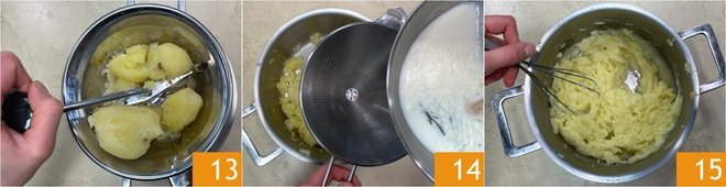 Peele the cooked potatoes roughly and pass them through a potato ricer while still hot 13. Add the milk little by little, filtering it through a sieve 14, and mix well with a hand whisk 15; adjust the amount of milk based on the consistency you want to achieve.