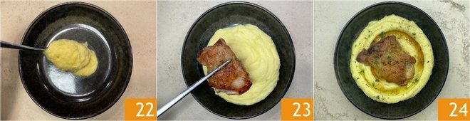 When the meat is cooked, you can plate: spread a bed of mashed potatoes at the base of the plate 22 and place a thigh on top 23. Drizzle with the cooking juices, then garnish with flakes of salt, pepper, and a few thyme leaves. Your chicken and mashed potatoes are ready to be served 24!